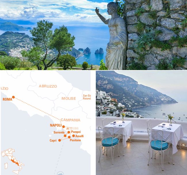Roma (sem hospedagem) > Sorrento > Pompéia > Capri > Positano > Nápoles (sem hospedagem)